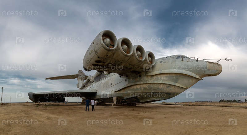 Панорамный боковой вид ржавого "Луны", советского ударного ракетоносца ekranoplan, заброшенного на пляже Каспийского моря. недалеко от города Дербент. уникальный военный корабль, прозванный Каспийским чудовищем