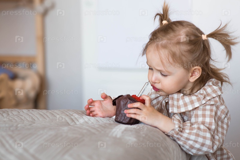 Двухлетняя девочка с кексом или пирожком со свечой в домашней обстановке. Праздничное утро. С днем рождения