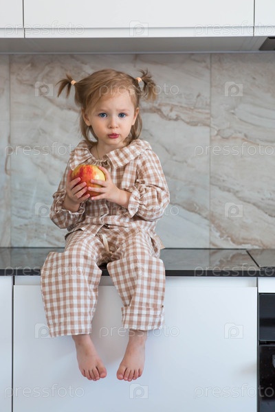 2-летняя девочка в пижаме сидит на столешнице кухни, ест яблоко. детское питание. кормление ребенка. здоровая еда. свежие овощи и фрукты