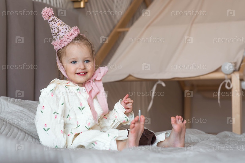 Двухлетняя девочка в праздничной шляпе с кексом или пирожком со свечой в домашней обстановке