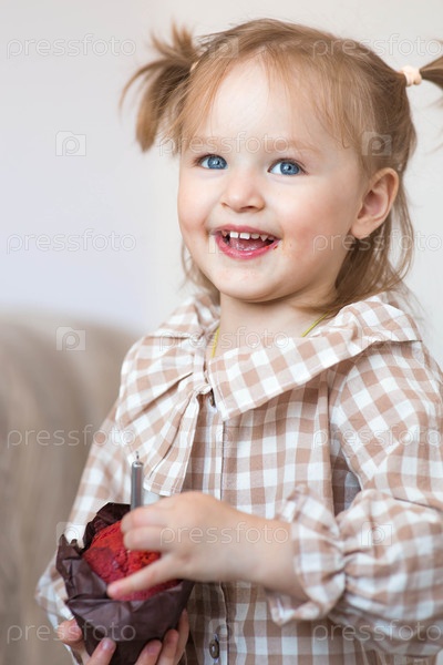 Двухлетняя девочка с кексом или пирожком со свечой в домашней обстановке. Праздничное утро. С днем рождения
