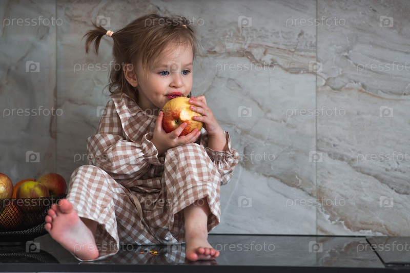 2-летняя девочка в пижаме сидит на столешнице кухни, ест яблоко. детское питание. кормление ребенка. здоровая еда. свежие овощи и фрукты