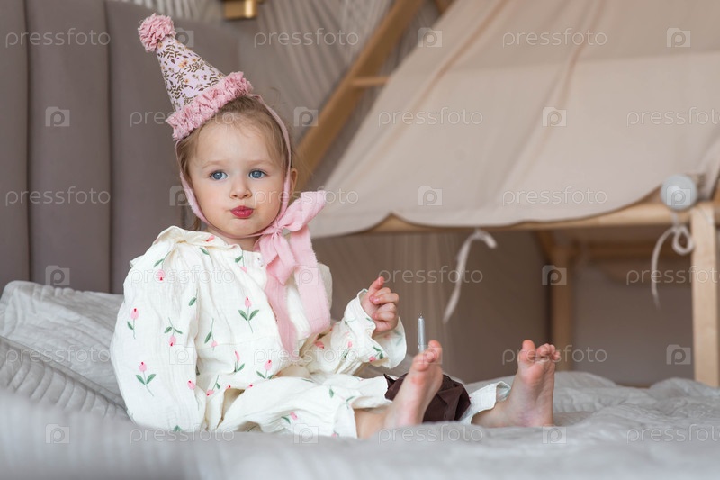 Двухлетняя девочка в праздничной шляпе с кексом или пирожком со свечой в домашней обстановке