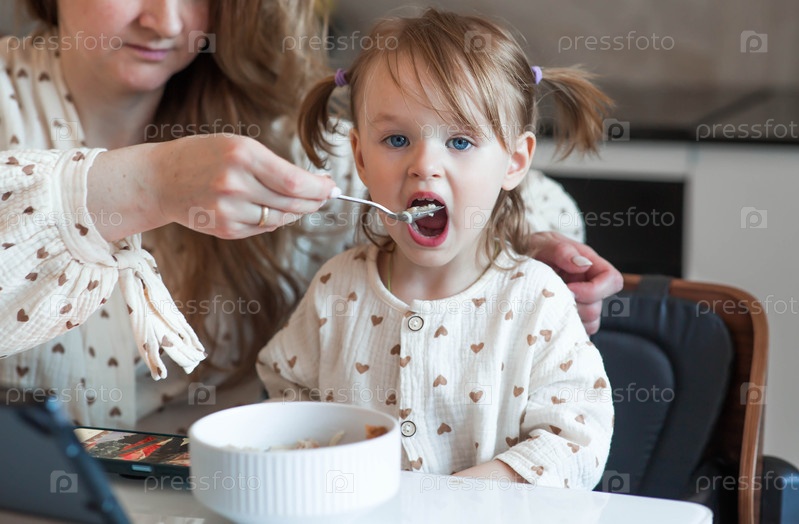 Двухлетняя милая девочка и ее мать сидят за обеденным столом.Мать кормит малыша ложкой.Детское питание.Кормление ребенка