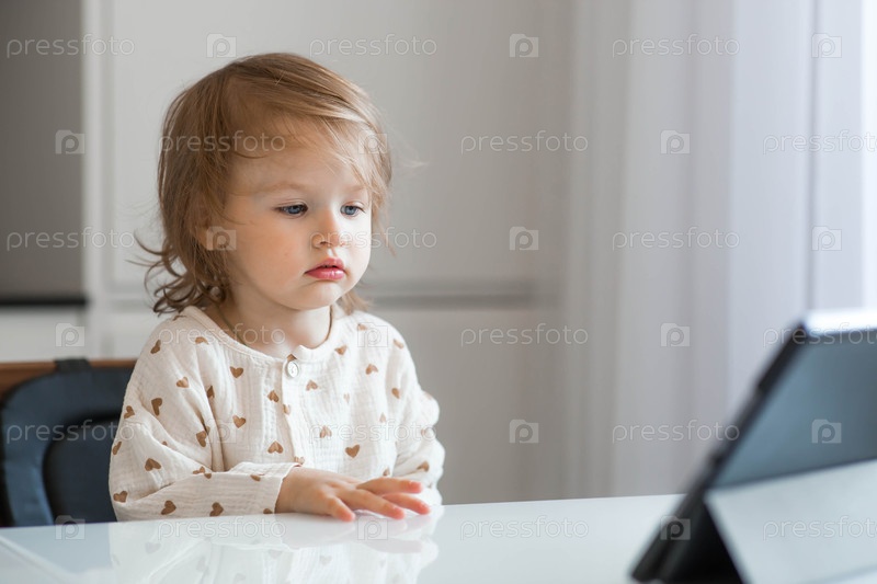 Милая маленькая 2-летняя девочка с планшетом. Ребенок смотрит на экран. Опасности гаджетов для детей. Защитите своего ребенка от смартфонов. Дети и гаджеты