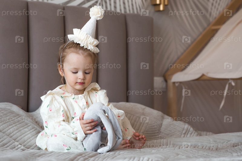 Двухлетняя девочка в праздничной шляпе с плюшевым кроликом в домашней обстановке на постели