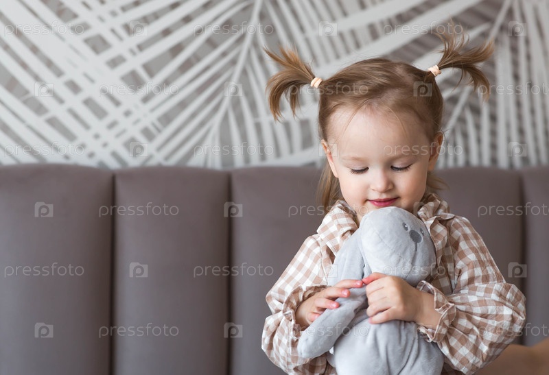 Двухлетняя девочка с плюшевым медведем в домашней обстановке на своей кровати
