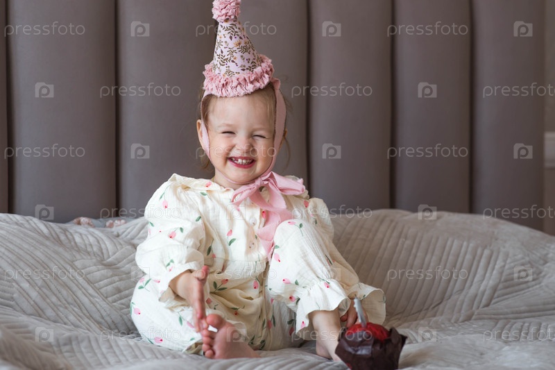 Двухлетняя девочка в праздничной шляпе с кексом или пирожком со свечой в домашней обстановке