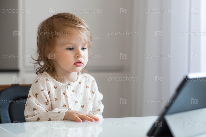 Милая маленькая 2-летняя девочка с планшетом. Ребенок смотрит на экран. Опасности гаджетов для детей. Защитите своего ребенка от смартфонов. Дети и гаджеты