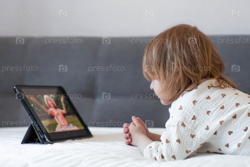 Милая маленькая 2-летняя девочка с планшетом. Ребенок смотрит на экран. Опасности гаджетов для детей. Защитите своего ребенка от смартфонов. Дети и гаджеты