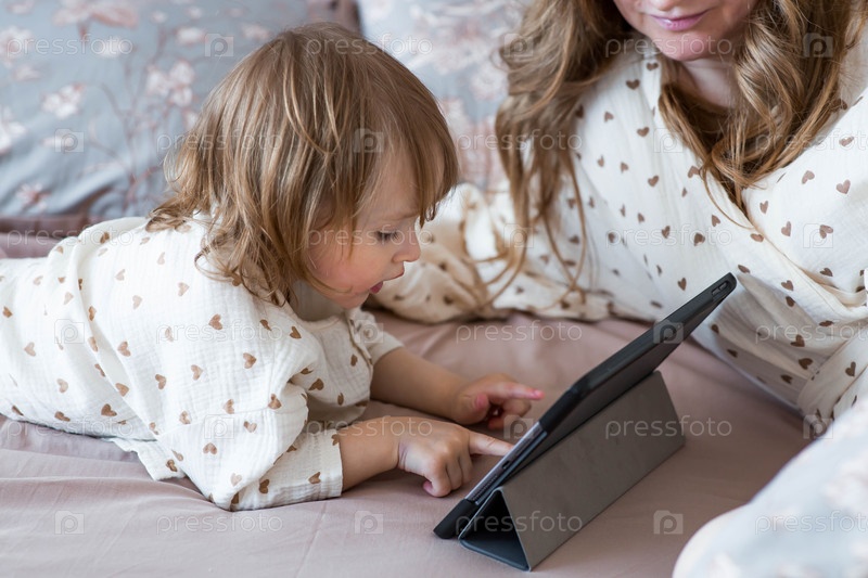 Милая двухлетняя девочка и ее мать с планшетом. Ребенок смотрит на экран. Опасность гаджетов для детей. Защитите своего ребенка от смартфонов. Дети и гаджеты