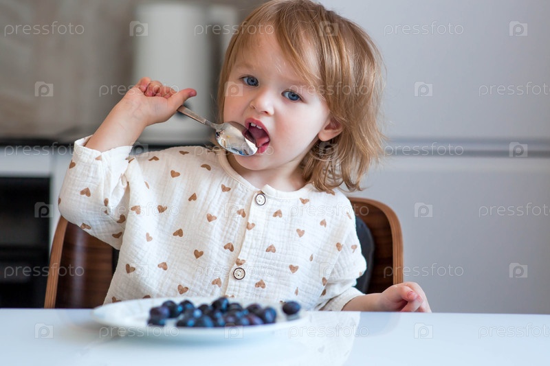 Двухлетняя милая девочка сидит за обеденным столом, ест чернику или малину. детское питание. кормление ребенка. здоровая закуска для детей