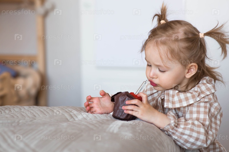Двухлетняя девочка с кексом или пирожком со свечой в домашней обстановке. Праздничное утро. С днем рождения