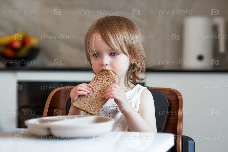 Двухлетняя милая девочка сидит за обеденным столом с куском черного хлеба