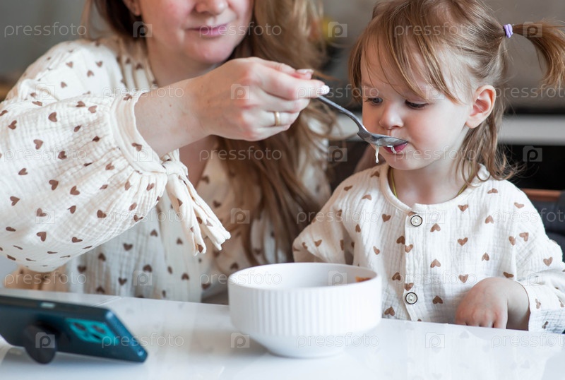 Двухлетняя милая девочка и ее мать сидят за обеденным столом.Мать кормит малыша ложкой.Детское питание.Кормление ребенка