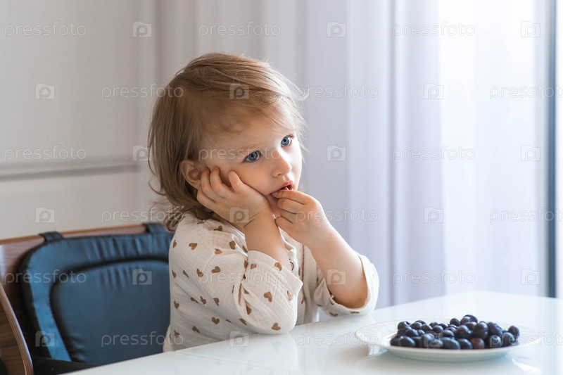 Двухлетняя милая девочка сидит за обеденным столом, ест чернику или малину. детское питание. кормление ребенка. здоровая закуска для детей