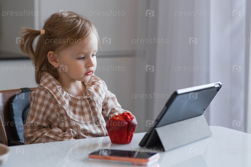 Милая 2-летняя девочка сидит за столом, ест кексы и играет с планшетом.Опасности гаджетов для детей.Защитите своего ребенка от смартфонов.Дети и гаджеты