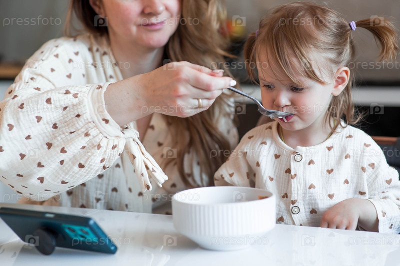 Двухлетняя милая девочка и ее мать сидят за обеденным столом.Мать кормит малыша ложкой.Детское питание.Кормление ребенка
