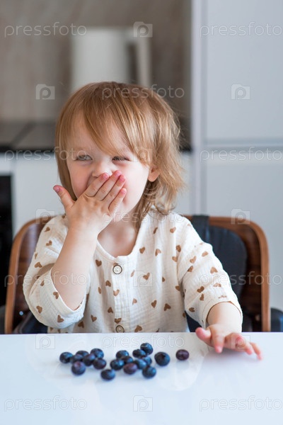 Двухлетняя милая девочка сидит за обеденным столом, ест чернику или малину. детское питание. кормление ребенка. здоровая закуска для детей