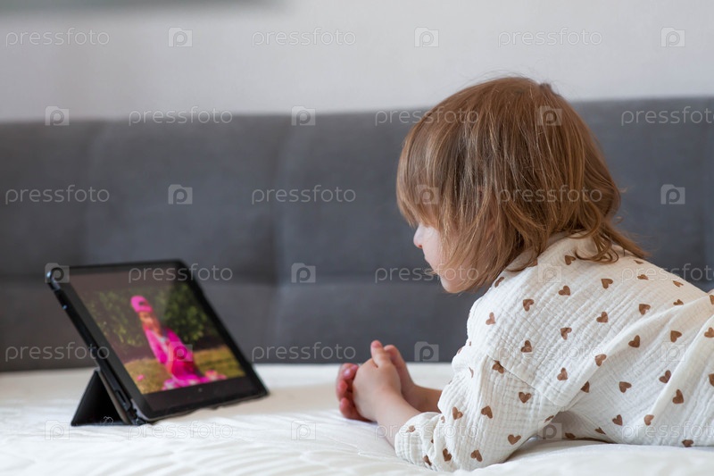 Милая маленькая 2-летняя девочка с планшетом. Ребенок смотрит на экран. Опасности гаджетов для детей. Защитите своего ребенка от смартфонов. Дети и гаджеты