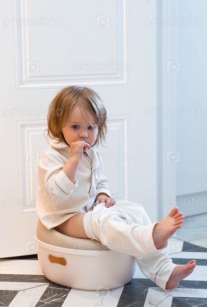 Милая двухлетняя девочка сидит на горшке в светлой комнате и учит ребенка пользоваться туалетом