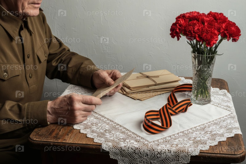Концепция праздника 9 мая. пожилой солдат читает старые военные письма, сидя за столом. на сером фоне есть ленточка Святого Георгия, буквы, военная шляпа и красные гвоздики