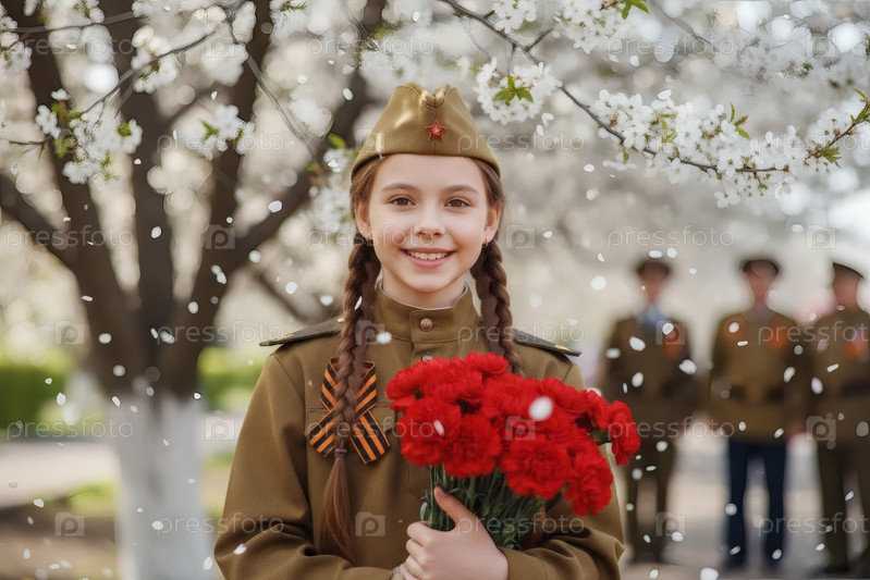 Концепция праздника 9 мая.Портрет девушки в военной форме с ленточкой Святого Георгия и красными гвоздиками, отмечающей День Победы в 1941-1945 годах