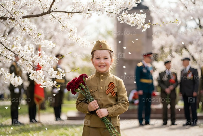 Концепция праздника 9 мая.Портрет девушки в военной форме с ленточкой Святого Георгия и красными гвоздиками, отмечающей День Победы в 1941-1945 годах