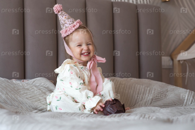 Двухлетняя девочка в праздничной шляпе с кексом или пирожком со свечой в домашней обстановке