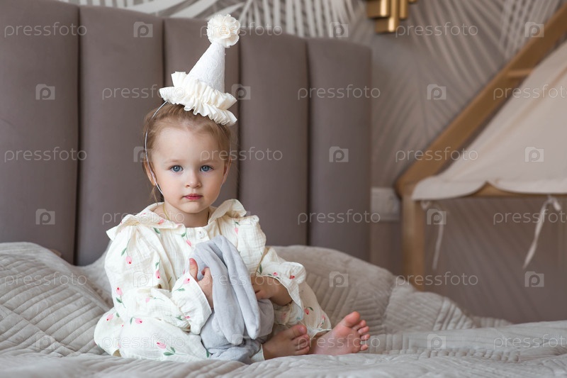 Двухлетняя девочка в праздничной шляпе с плюшевым кроликом в домашней обстановке на постели