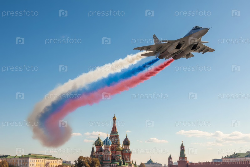 Российский истребитель с нарисованным российским флагом в небе над Красной площадью на Параде Победы 9 мая