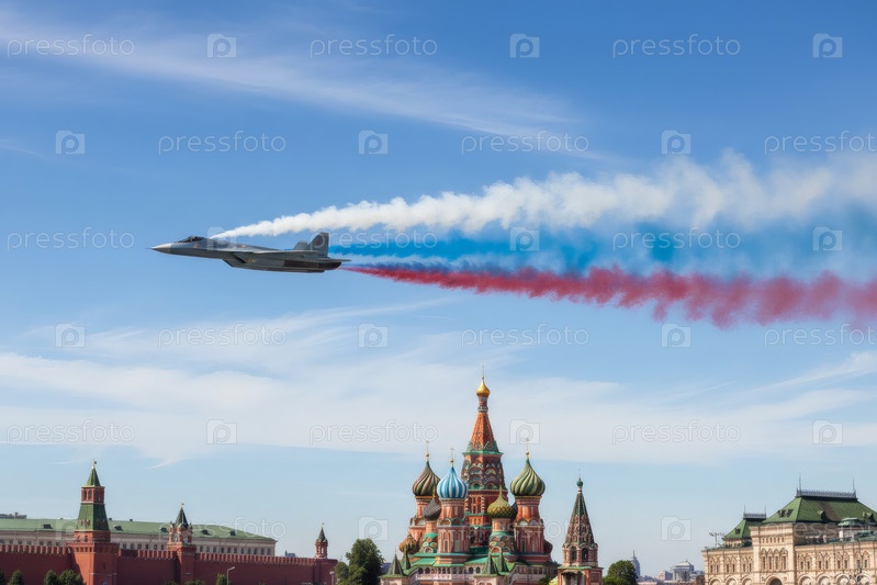 Российский истребитель с нарисованным российским флагом в небе над Красной площадью на Параде Победы 9 мая