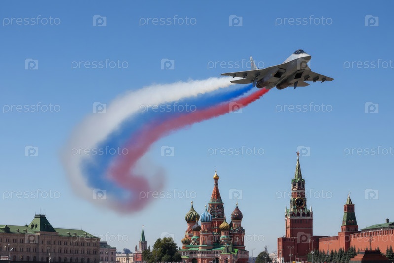 Российский истребитель с нарисованным российским флагом в небе над Красной площадью на Параде Победы 9 мая
