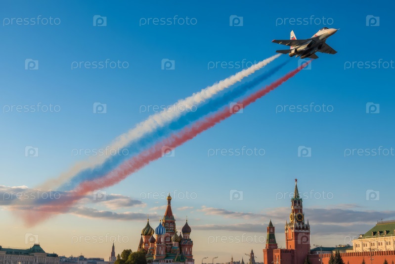 Российский истребитель с нарисованным российским флагом в небе над Красной площадью на Параде Победы 9 мая