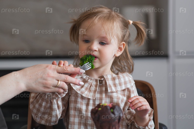 Мать кормит маленькую девочку брокколи, и на столе лежит кекс. Ребенок отказывается есть овощи. Детская еда. Здоровая и нездоровая пища