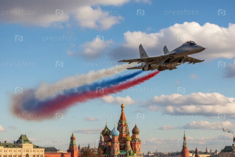 Российский истребитель с нарисованным российским флагом в небе над Красной площадью на Параде Победы 9 мая