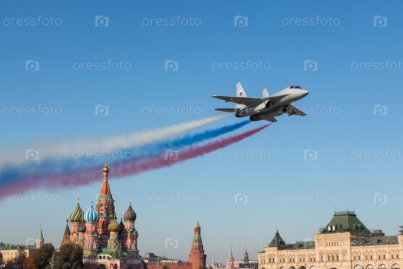 Российский истребитель с нарисованным российским флагом в небе над Красной площадью на Параде Победы 9 мая