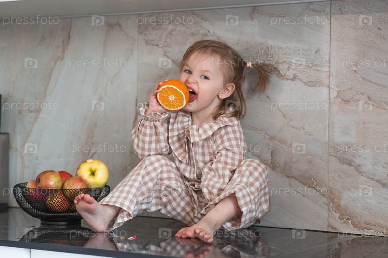 2-летняя девочка в пижаме сидит на столешнице кухни, ест апельсин. детское питание. кормление ребенка. здоровая еда. свежие овощи и фрукты