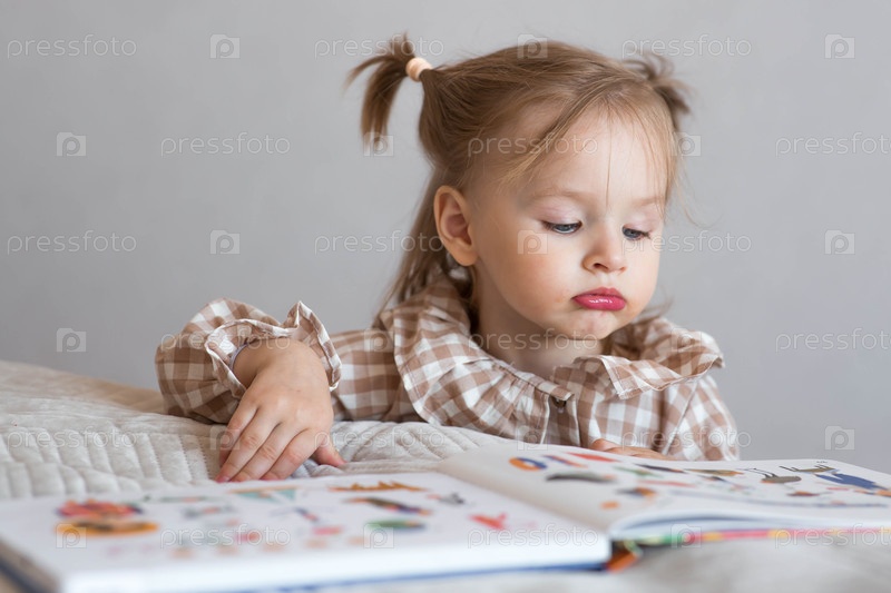 2-летняя девочка в пижаме и с двумя хвостиками смотрит или читает детскую книгу на своей кровати