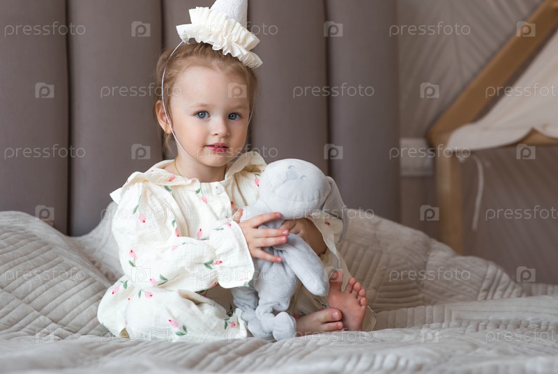 Двухлетняя девочка в праздничной шляпе с плюшевым кроликом в домашней обстановке на постели