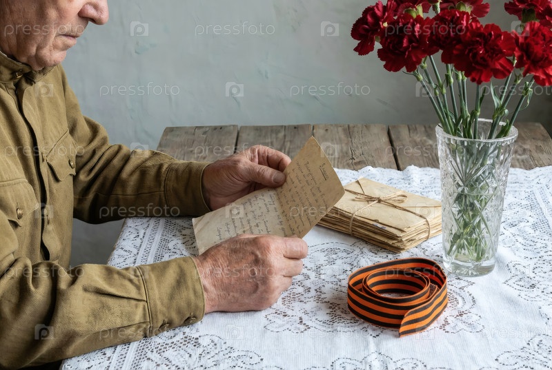 Концепция праздника 9 мая. пожилой солдат читает старые военные письма, сидя за столом. на сером фоне есть ленточка Святого Георгия, буквы, военная шляпа и красные гвоздики