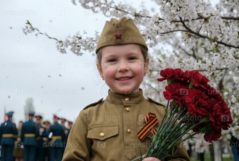 Концепция праздника 9 мая.Портрет девушки в военной форме с ленточкой Святого Георгия и красными гвоздиками, отмечающей День Победы в 1941-1945 годах