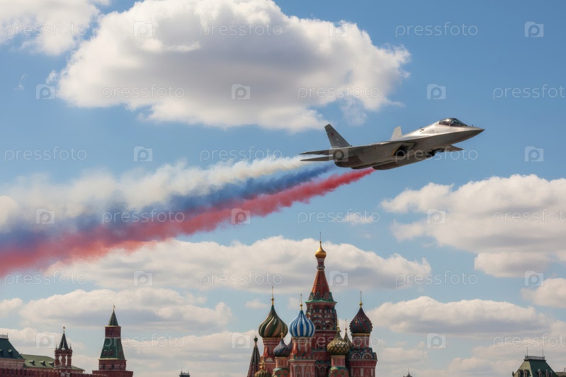 Российский истребитель с нарисованным российским флагом в небе над Красной площадью на Параде Победы 9 мая