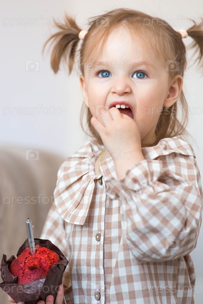 Двухлетняя девочка с кексом или пирожком со свечой в домашней обстановке. Праздничное утро. С днем рождения
