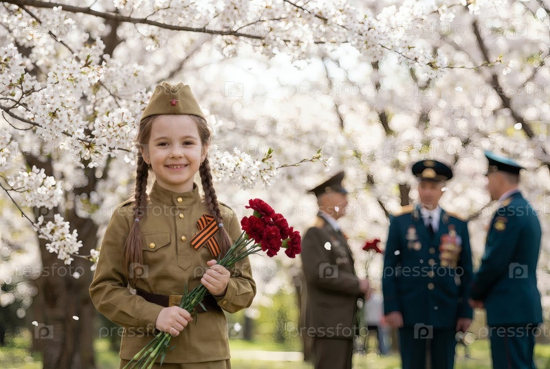 Концепция праздника 9 мая.Портрет девушки в военной форме с ленточкой Святого Георгия и красными гвоздиками, отмечающей День Победы в 1941-1945 годах