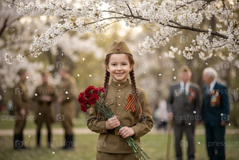 Концепция праздника 9 мая.Портрет девушки в военной форме с ленточкой Святого Георгия и красными гвоздиками, отмечающей День Победы в 1941-1945 годах