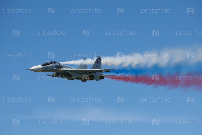 Российский истребитель с нарисованным российским флагом в небе над Красной площадью на Параде Победы 9 мая