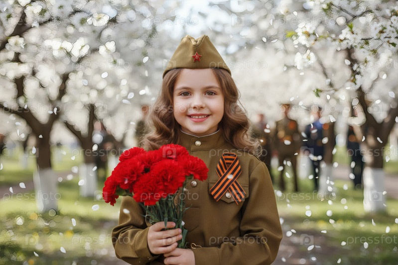 Концепция праздника 9 мая.Портрет девушки в военной форме с ленточкой Святого Георгия и красными гвоздиками, отмечающей День Победы в 1941-1945 годах