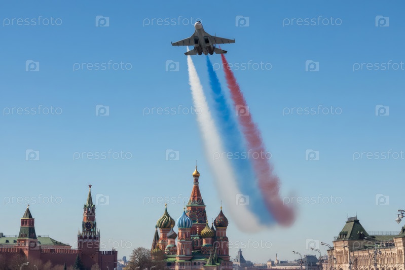 Российский истребитель с нарисованным российским флагом в небе над Красной площадью на Параде Победы 9 мая