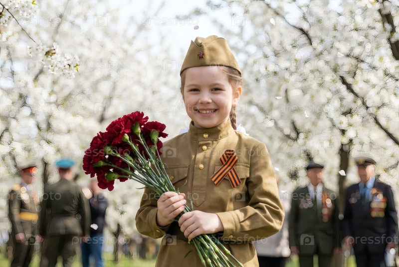 Концепция праздника 9 мая.Портрет девушки в военной форме с ленточкой Святого Георгия и красными гвоздиками, отмечающей День Победы в 1941-1945 годах